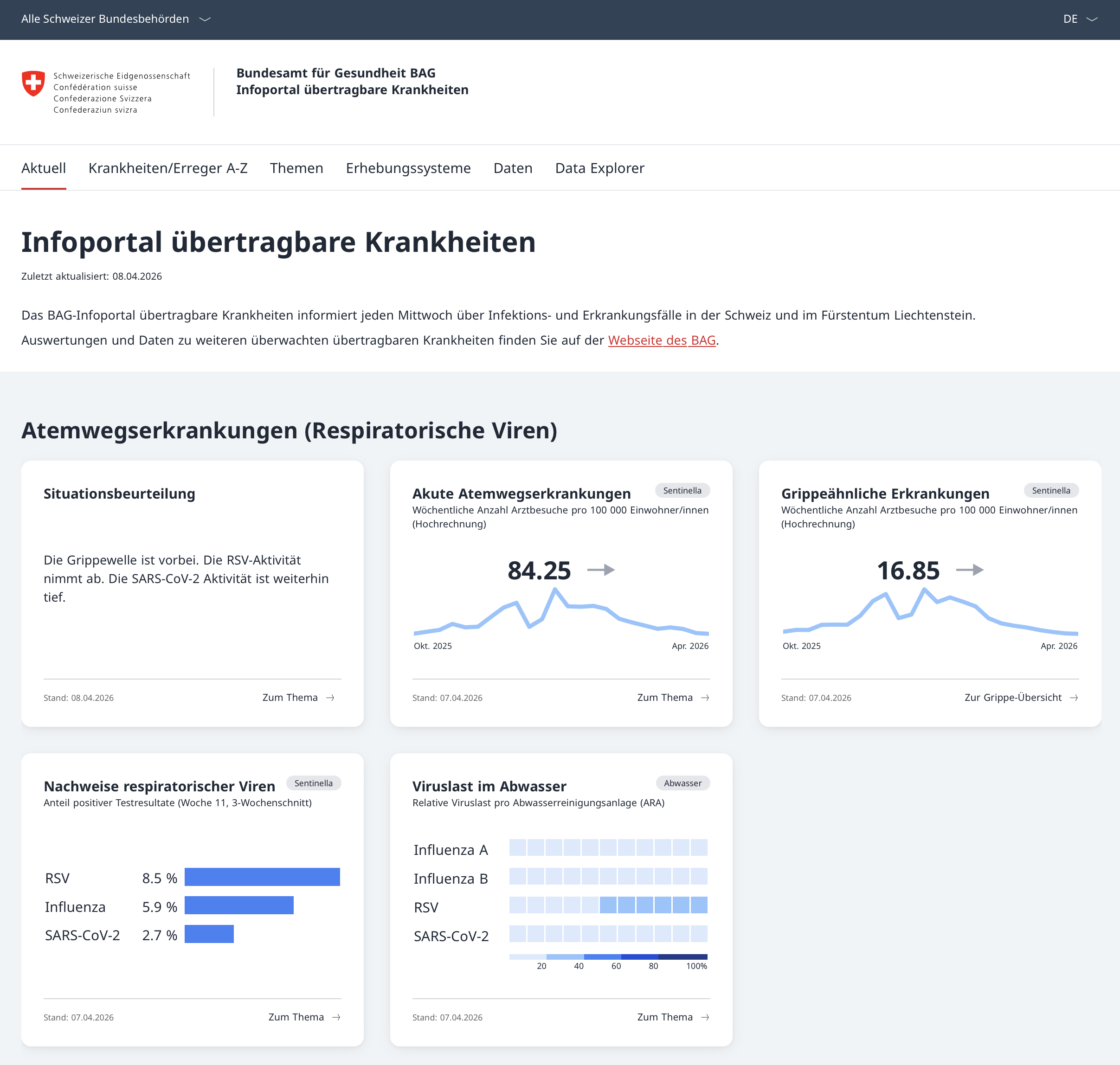 - Für den Bereich «Übertragbare Krankheiten» des BAG entwickelten wir ein modulares, interaktives Dashboard zur Visualisierung von über 50 Krankheiten. Die Daten werden periodisch vom BAG auf die Plattform gepusht und stehen dort sowohl in ihrer ursprünglichen Form als auch via API-Abfrage frei zur Verfügung.